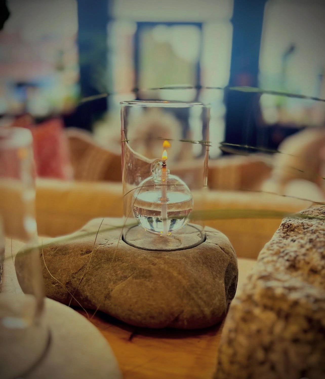 Oil lamps and votive lamps in beach stone or cobblestone.